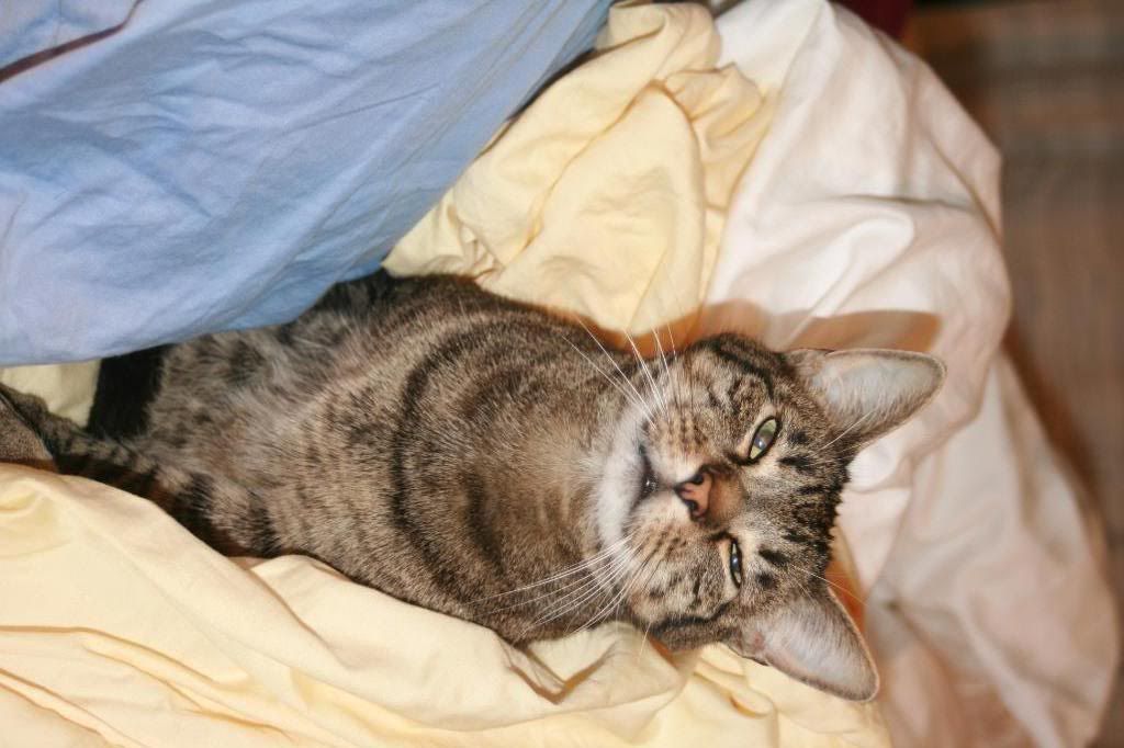 Leo's new favorite thing to do is creating a kitty "cave" in the bed linens. Goofy cat.